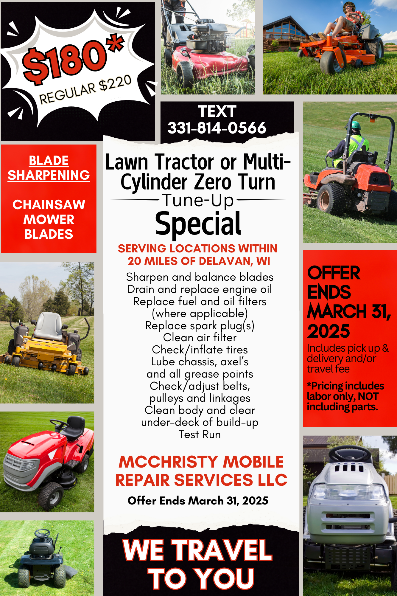 We provide sharpening and small engine repair services in the Walworth County, Wisconsin area and any location within twenty (20) Miles of Delavan, Wisconsin! WE TRAVEL TO YOU!